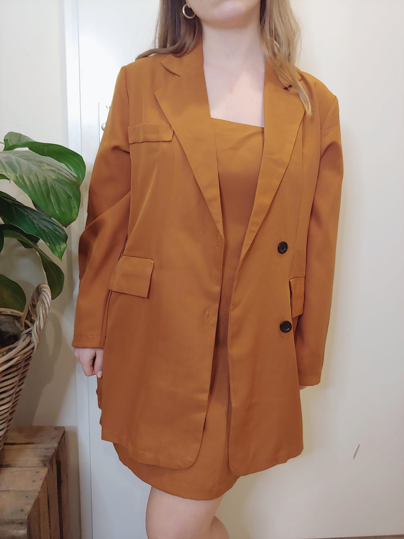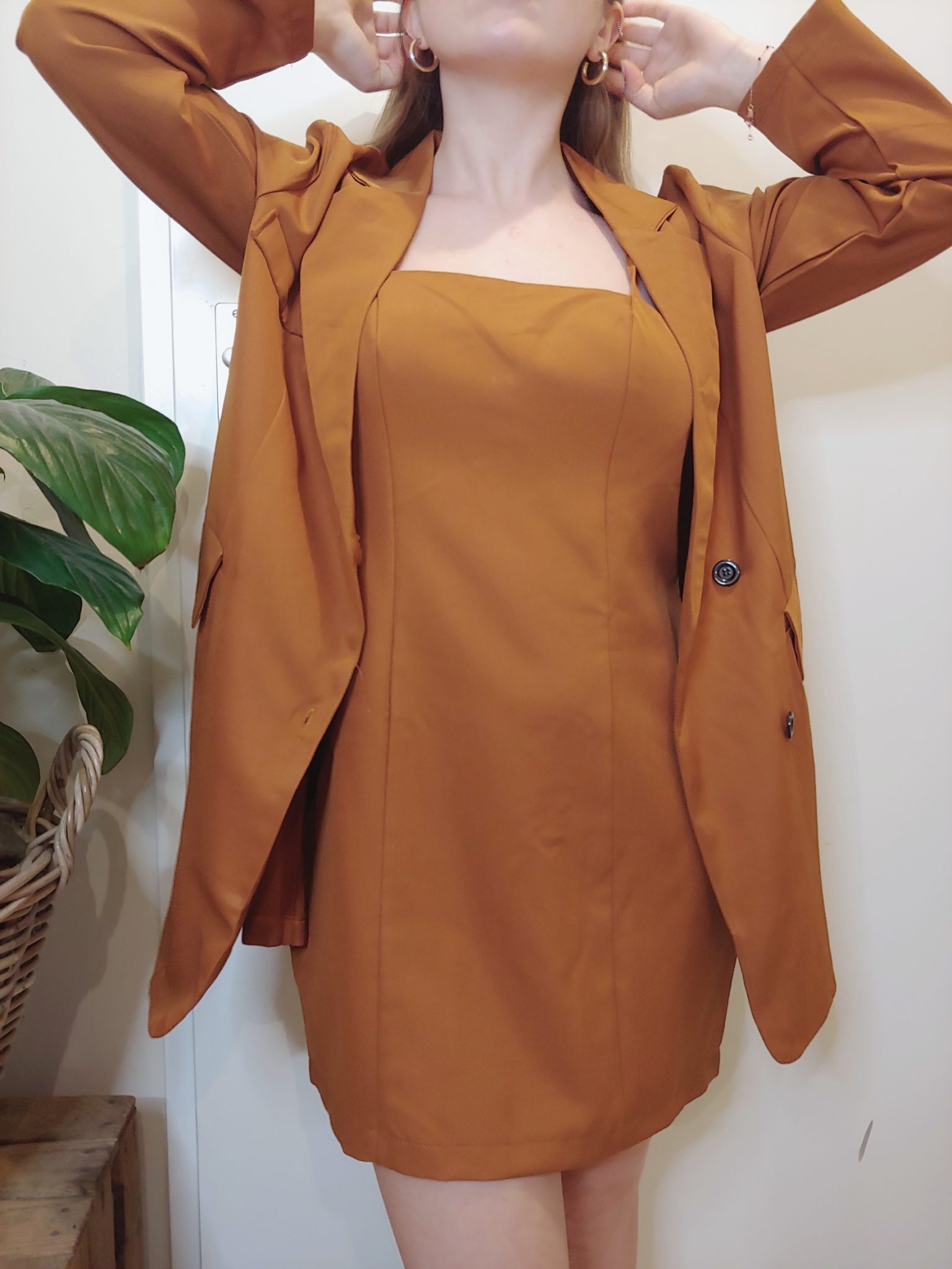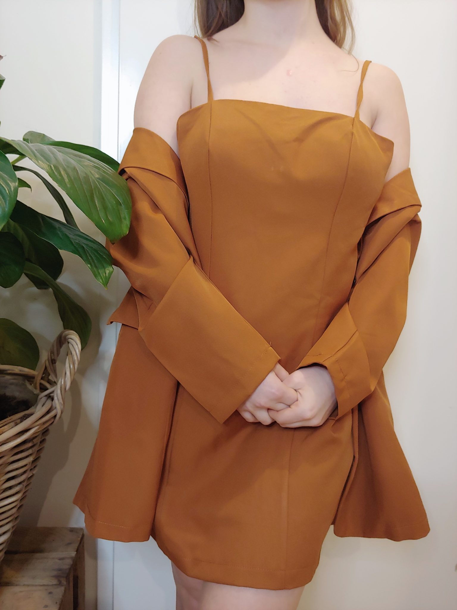 The set includes a dress and a vest. The dress is straight form and has built-in bra.